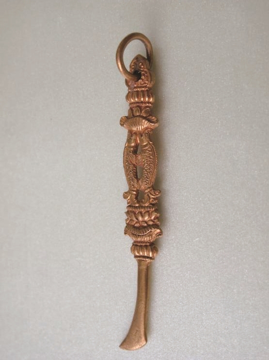 透雕双鱼纹金指剔(图3),长6.6厘米,宽1厘米。柄首为三曲花形,连套环。下连双鱼对立纹,上托仰莲,其下方似踏一人物,底座为莲花台。